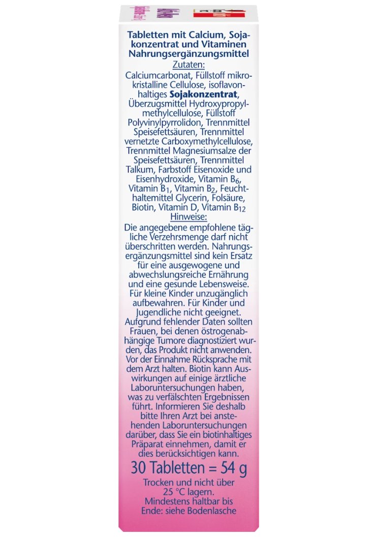 Ingredients: Calcium carbonate, isoflavone-rich soy concentrate, bulking agent gum arabic, bulking agent microcrystalline cellulose, anti-caking agent silicon dioxide, bulking agent cellulose powder, bulking agent cross-linked carboxymethylcellulose, hyaluronic acid-containing collagen hydrolysate, glazing agent hydroxypropylmethylcellulose, anti-caking agent calcium salts of fatty acids, anti-caking agent magnesium hydroxide carbonate, bulking agent hydroxypropylcellulose, glazing agent polyethylene glycol, anti-caking agent talc, pyridoxine hydrochloride, thiamine mononitrate, color iron oxides and iron hydroxides, riboflavin, pteroylmonoglutamic acid, D-biotin, cholecalciferol, cyanocobalamin