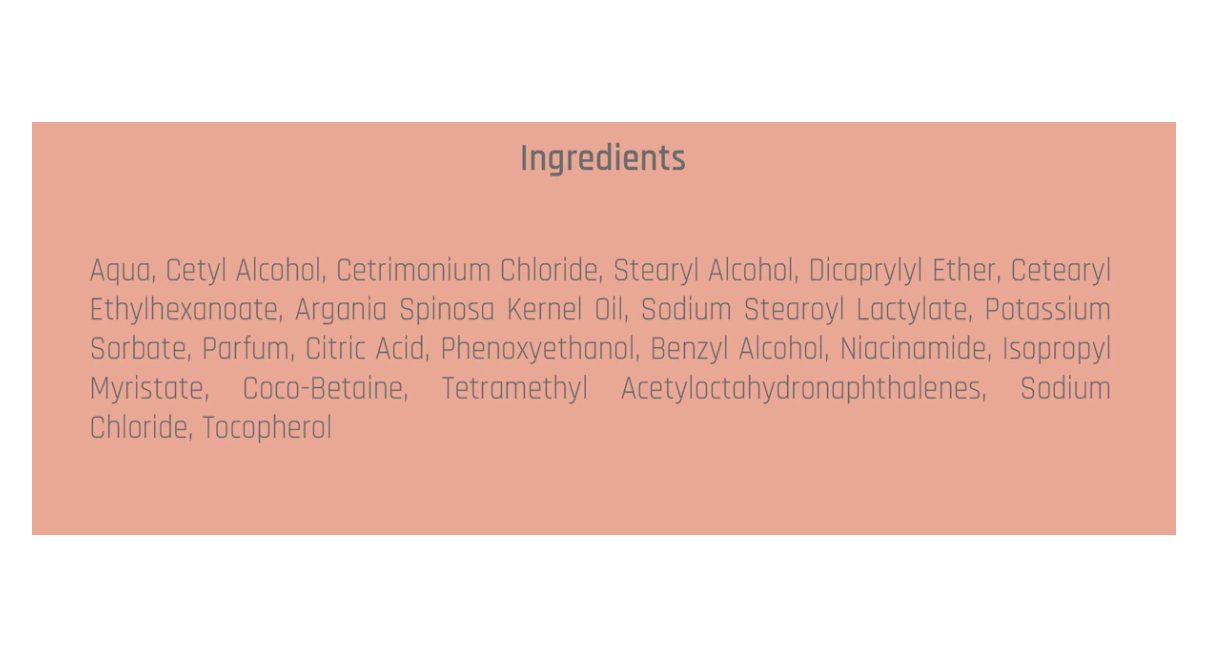 Ingredients: Aqua, Cetyl Alcohol, Cetrimonium Chloride, Stearyl Alcohol, Dicaprylyl Ether, Cetearyl Ethylhexanoate, Argania Spinosa Kernel Oil, Sodium Stearoyl Lactylate, Potassium Sorbate, Parfum, Citric Acid, Phenoxyethanol, Benzyl Alcohol, Niacinamide, Isopropyl Myristate, Coco-Betaine, Tetramethyl Acetyloctahydronaphthalenes, sodium chloride, tocopherol