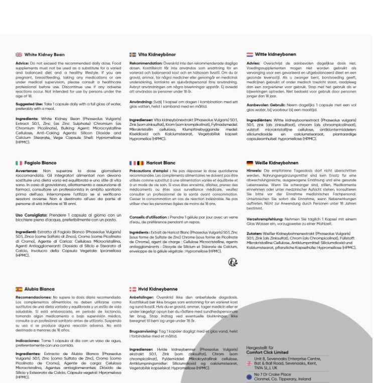 Extrakt aus weißen Kidneybohnen (Phaseolus Vulgaris) 50:1, Zink (als Zinksulfat) Chrom (als Chrompicolinat), Füllstoff: Braunes Reismehl, Trennmittel: Magnesiumstearat und Siliziumdioxid, pflanzliche Kapselhülle: Hypromellose (HPMC)