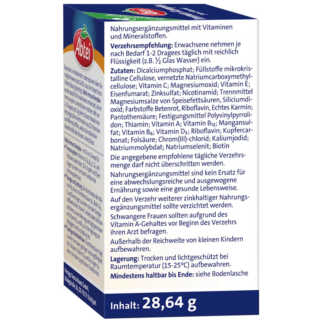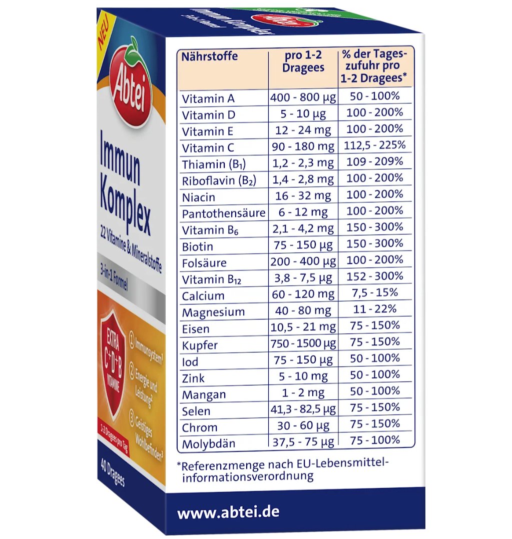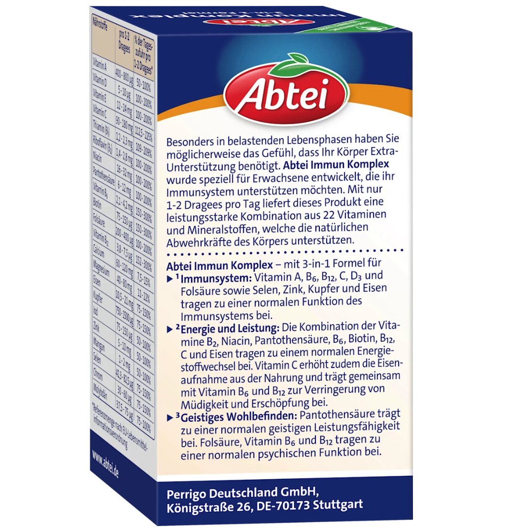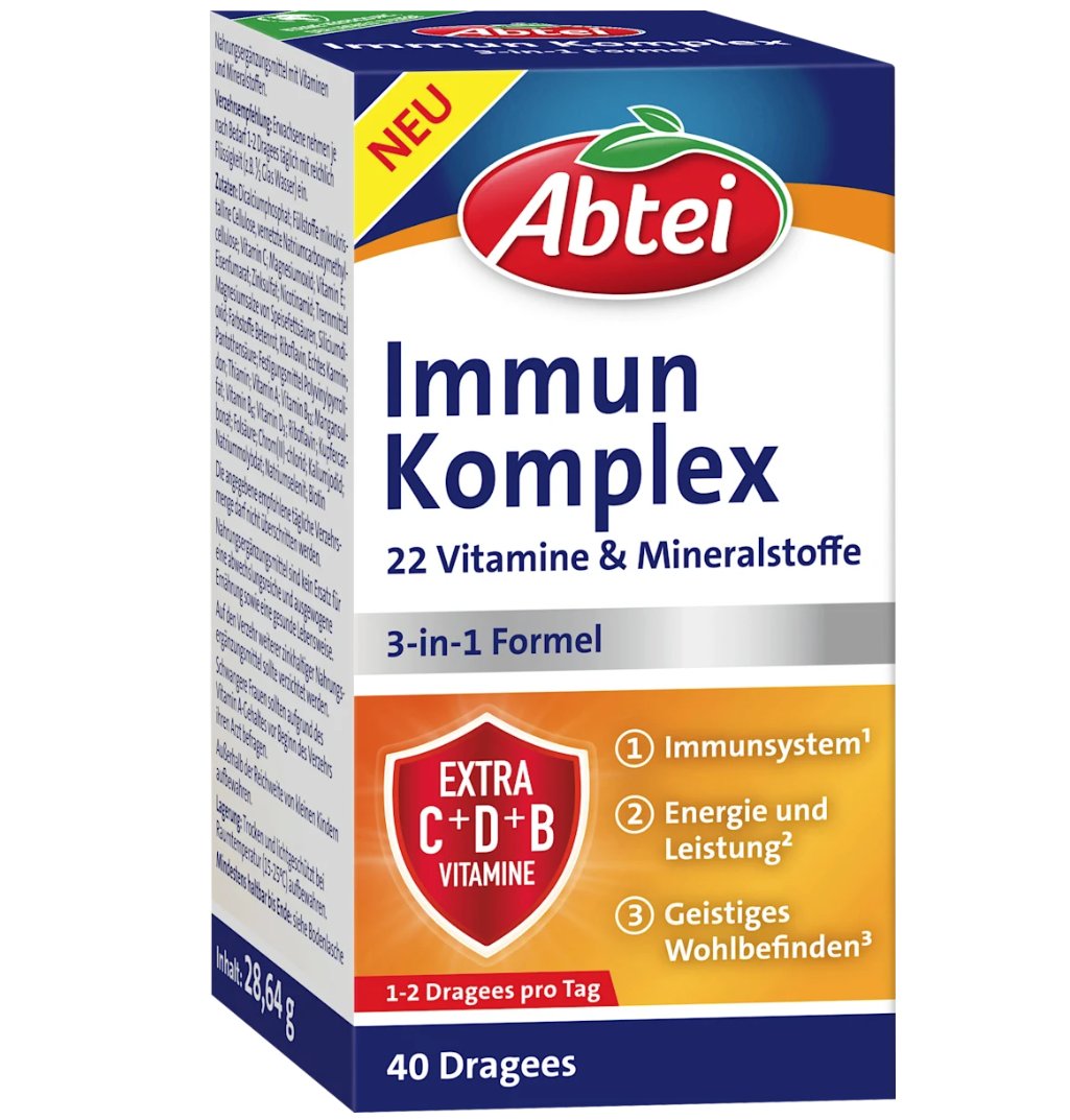 Abtei 的免疫複合物錠 採用三合一配方,包含 22 種精選維生素和礦物質。其中添加的維生素 D 和鋅有助於維持免疫系統的正常功能。靈活的劑量設計,使其既適合日常服用,也適合在需要加強免疫力的時期服用。 Abtei 的這款複合物,為您提供了一種便捷的日常營養補充方式。