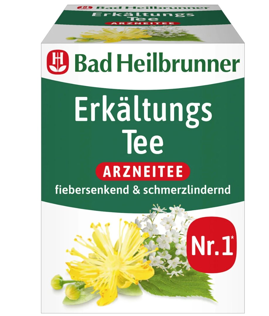 巴特海爾布倫的感冒和流感茶,添加了柳樹皮和菩提花,可以退燒並緩解感冒引起的疼痛。這種裝在濾袋裡的藥用茶還能緩解感染引起的頭痛。
