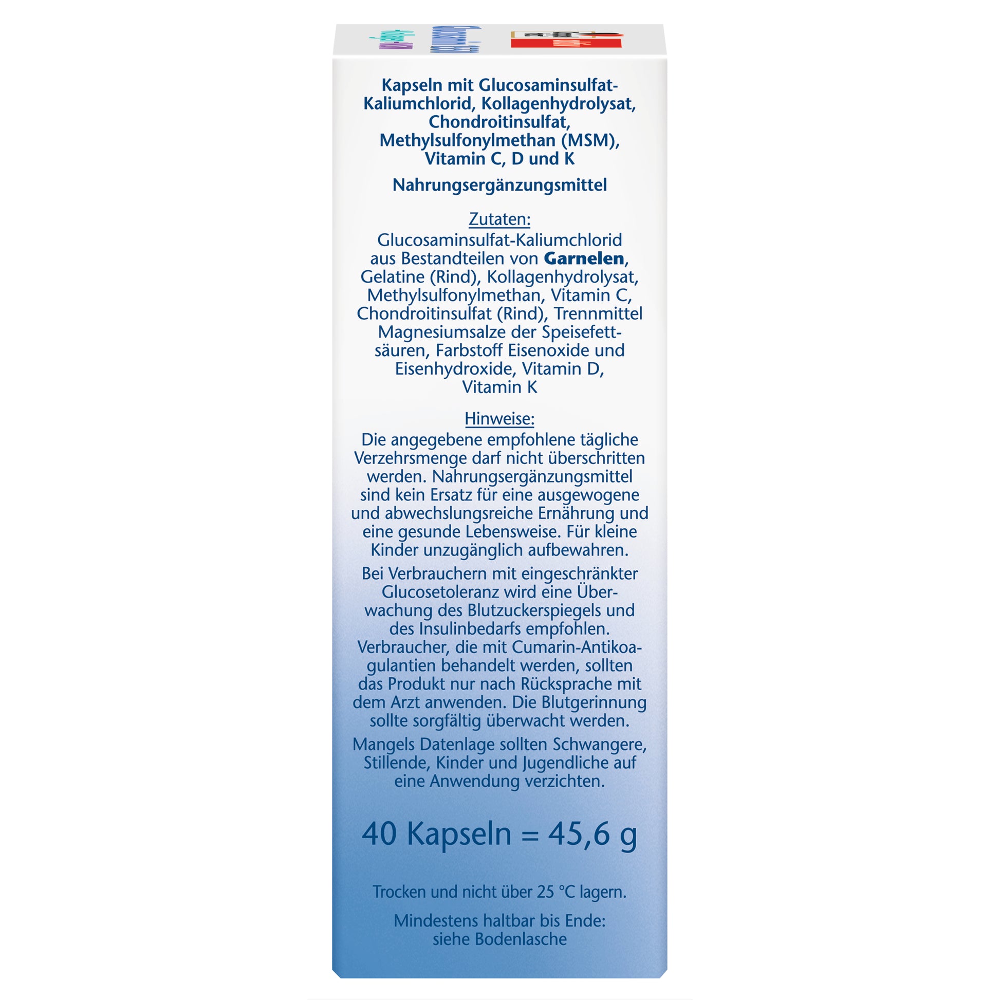 葡萄糖胺硫酸鉀氯化物來自蝦類成分,明膠(牛肉),膠原蛋白水解物,甲基磺酰甲烷,維生素C,軟骨素硫酸鹽(牛肉),分離劑(食品脂肪酸的鎂鹽),顏料(鐵氧化物和鐵氫氧化物),維生素D,維生素K