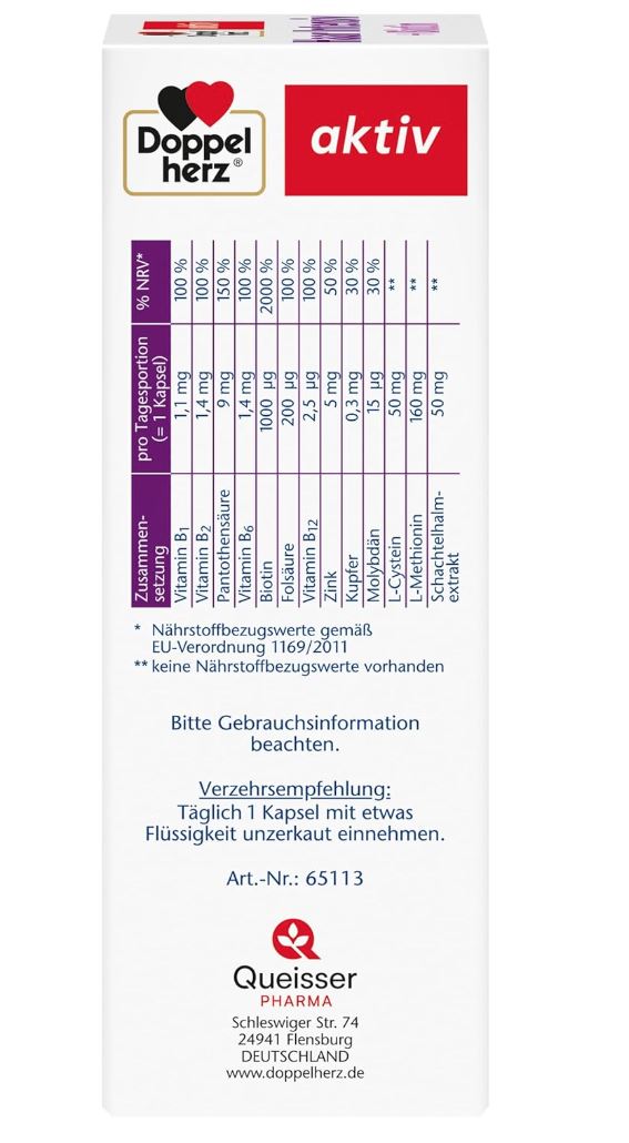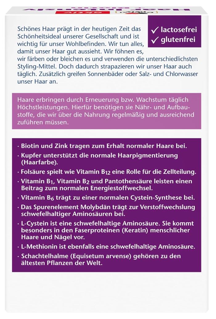 膨鬆劑微晶纖維素、L-蛋氨酸、明膠 (牛)、L-半胱氨酸、馬尾草萃取物、泛酸、碳酸鋅、麥芽糊精、抗結劑脂肪酸鎂鹽、抗結劑二氧化矽、維生素 B6、維生素 B2、維生素 B1、著色劑氧化鐵與氫氧化鐵、生物素、碳酸銅、葉酸、鉬酸鈉、維生素 B12。
