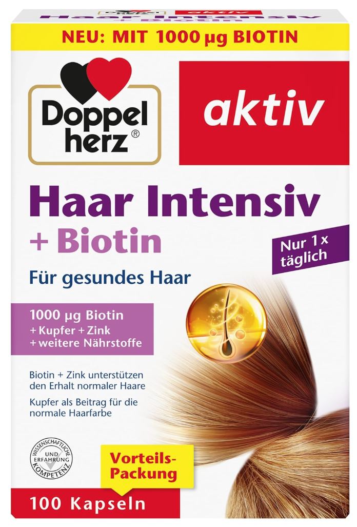 Doppelherz Hair Intensive + Biotin 的膠囊結合了維生素、微量元素、L-半胱氨酸、L-蛋氨酸和馬尾草萃取物。