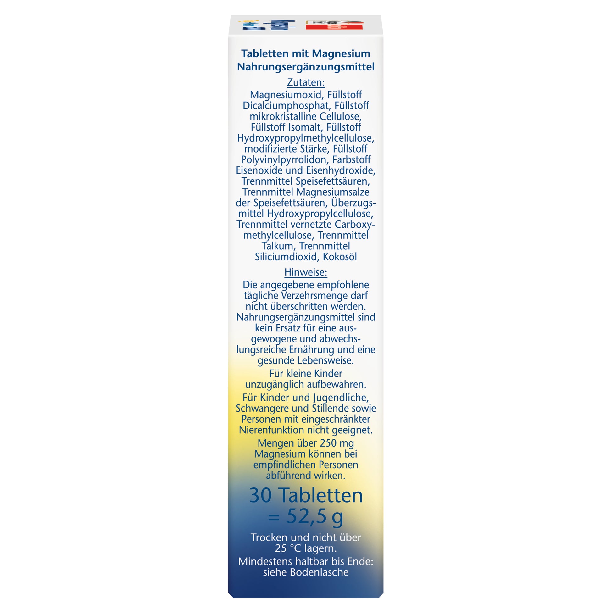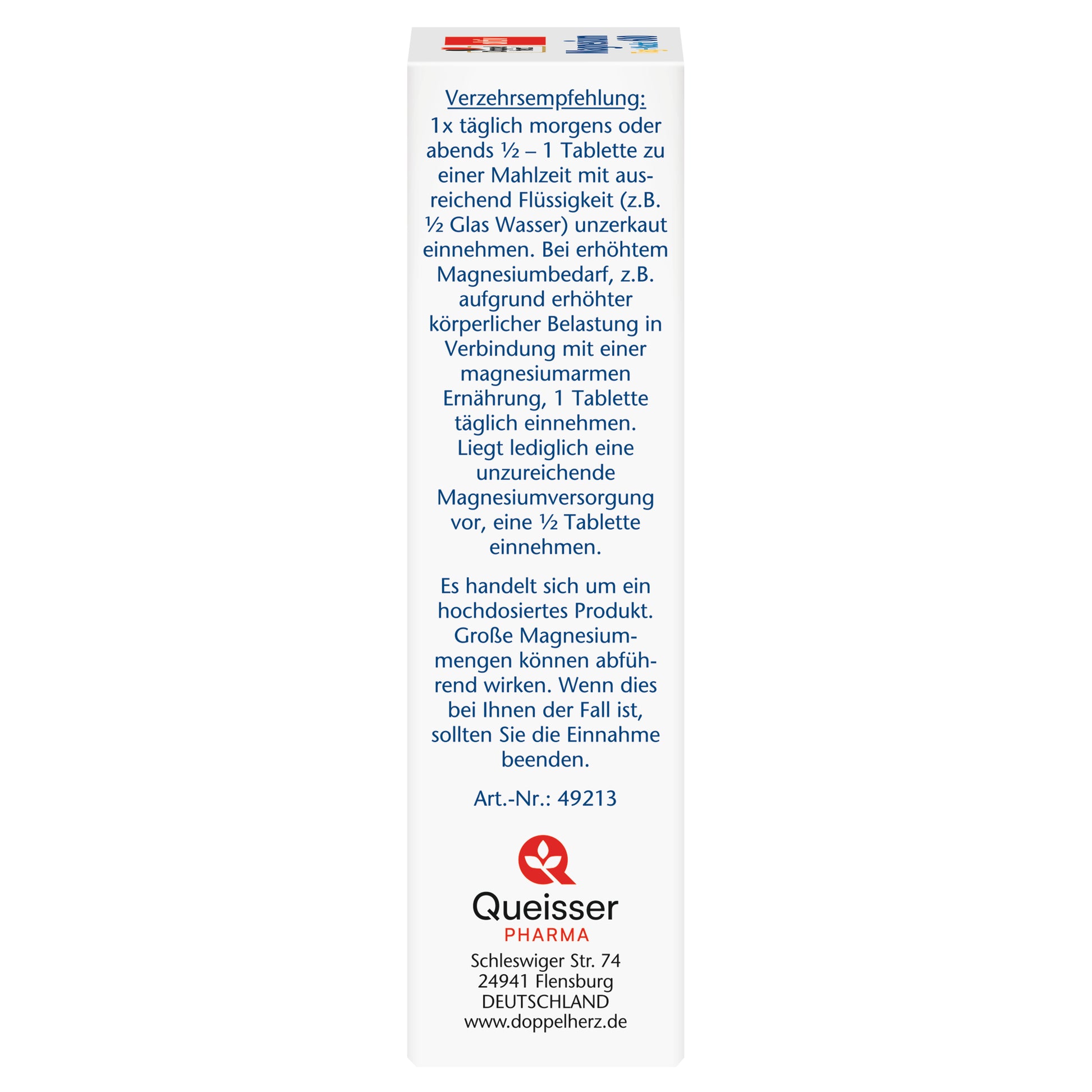 每日早晚服用半片至一片,隨餐服用,並飲用足量液體(如半杯水),無需咀嚼。如果您的鎂需求增加,例如由於體力消耗增加且飲食中鎂缺乏,則每天服用一片。如果您的鎂攝取量不足,則服用半片。