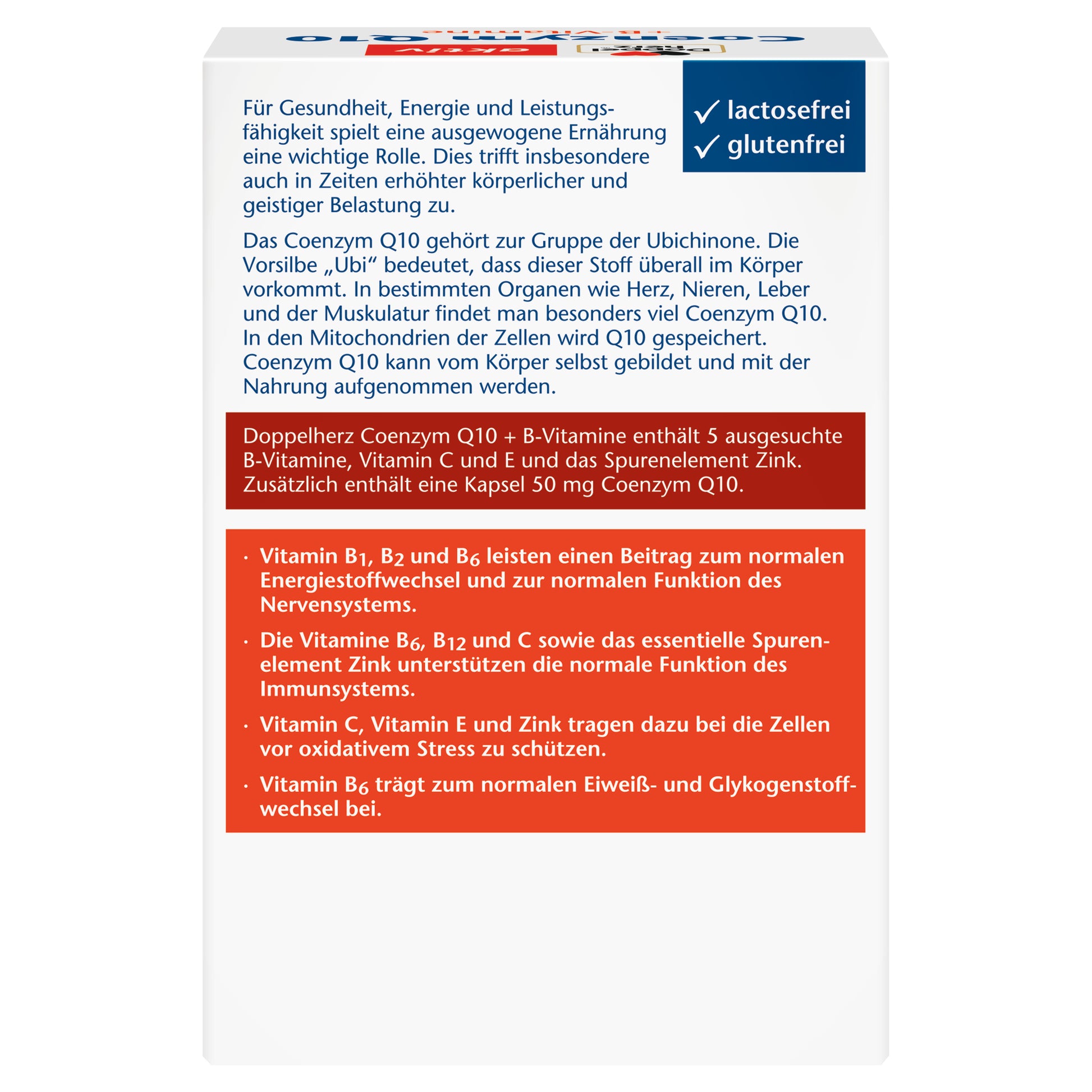 Doppelherz 輔酶 Q10 + B族維生素包含五種精選的 B族維生素(B1、B2、B5、B6 和 B12)、維生素 C、維生素 E,以及微量元素鋅。此外,每顆膠囊額外提供 50 毫克輔酶 Q10。