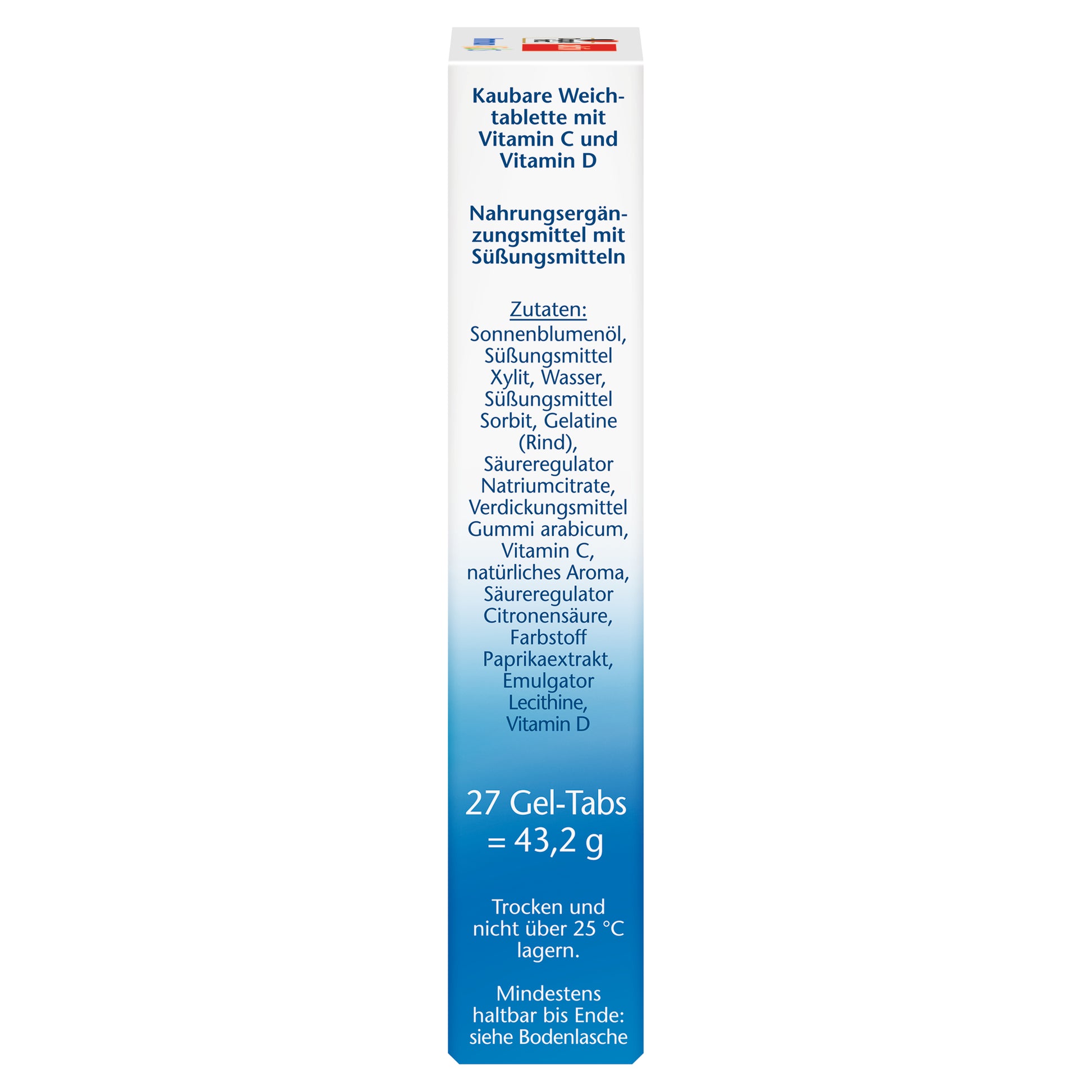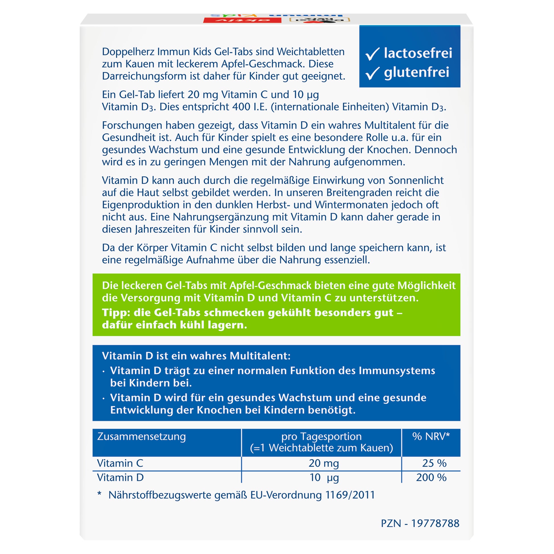 雙心免疫兒童凝膠片是柔軟的咀嚼片,帶有美味的蘋果味。因此,這種劑型非常適合兒童服用。一片凝膠片含有20毫克維生素C和10微克維生素D3,相當於400國際單位(IU)維生素D3。