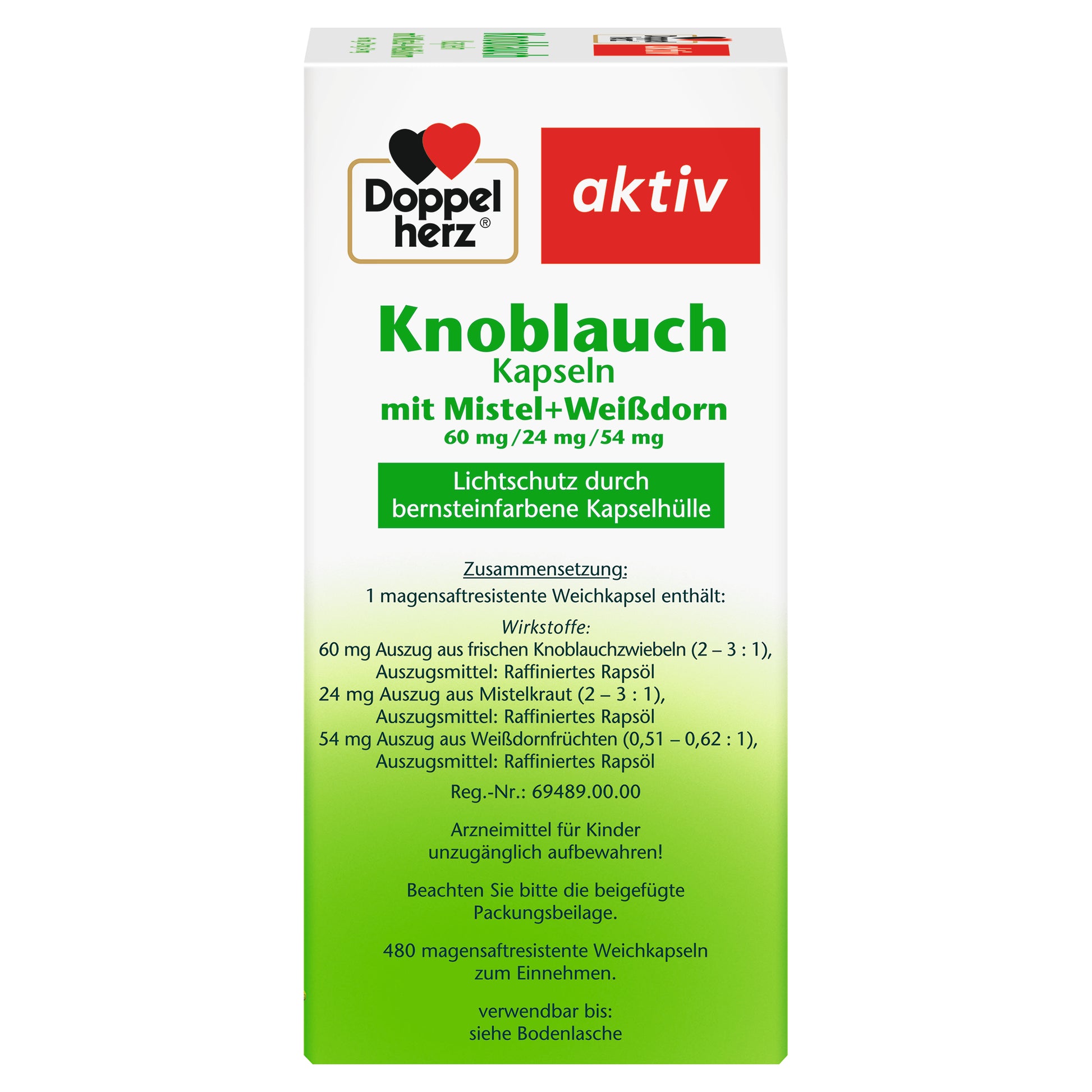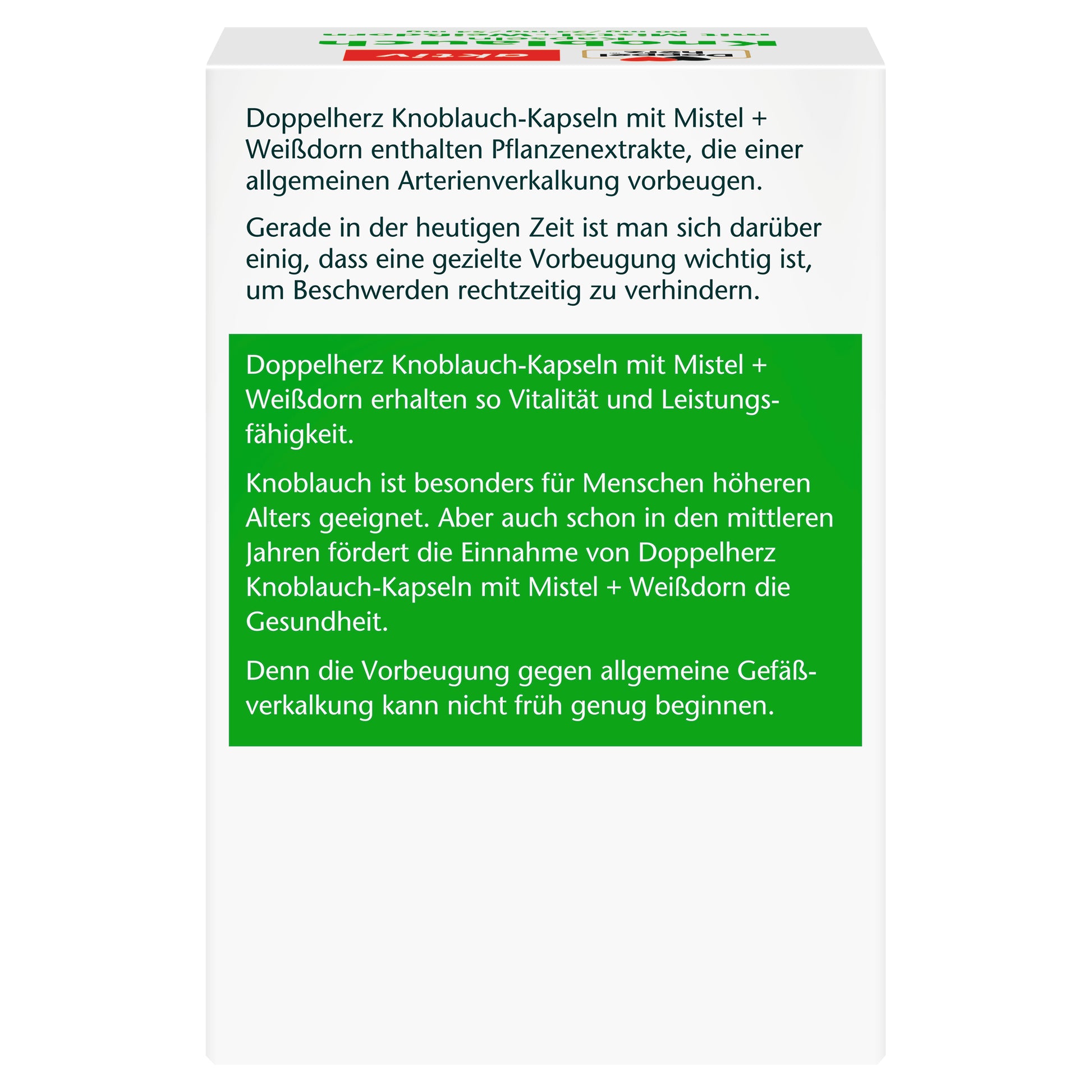 Doppelherz Knoblauch-Kapseln mit Mistel + Weißdorn 60 mg/ 24 mg/ 54 mg, magensaftresistente Weichkapseln. Für Erwachsene. Wirkstoffe: Knoblauchzwiebel-Auszug, Mistelkraut-Auszug, Weißdornfrüchte-Auszug. Anwendungsgebiet: Traditionelles pflanzliches Arzneimittel angewendet zur Vorbeugung der allgemeinen Arterienverkalkung (allgemeine Arteriosklerose) ausschließlich aufgrund langjähriger Anwendung. Zu Risiken und Nebenwirkungen lesen Sie die Packungsbeilage und fragen Sie Ihre Ärztin, Ihren Arzt oder in der Apotheke. Stand 03/2018