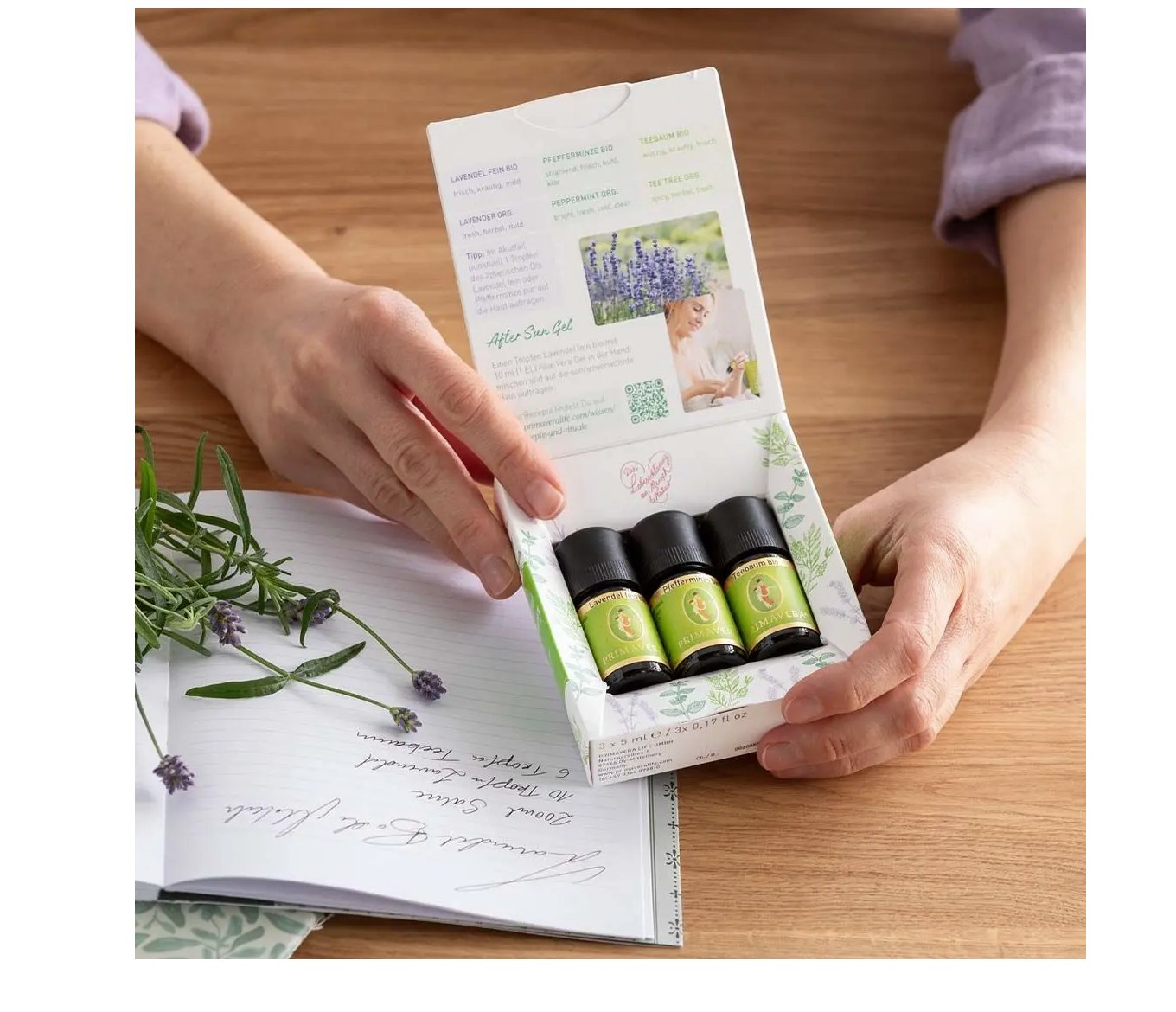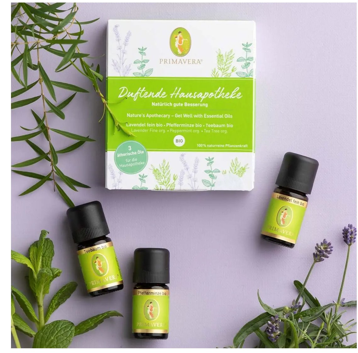 一組包含三種最重要的家用精油:薰衣草、薄荷和茶樹。是旅行和饋贈的理想選擇。