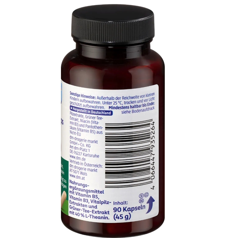 含有維生素B5、維生素B3、藥用蘑菇萃取物和綠茶萃取物的膳食補充劑,含40% L-茶胺酸