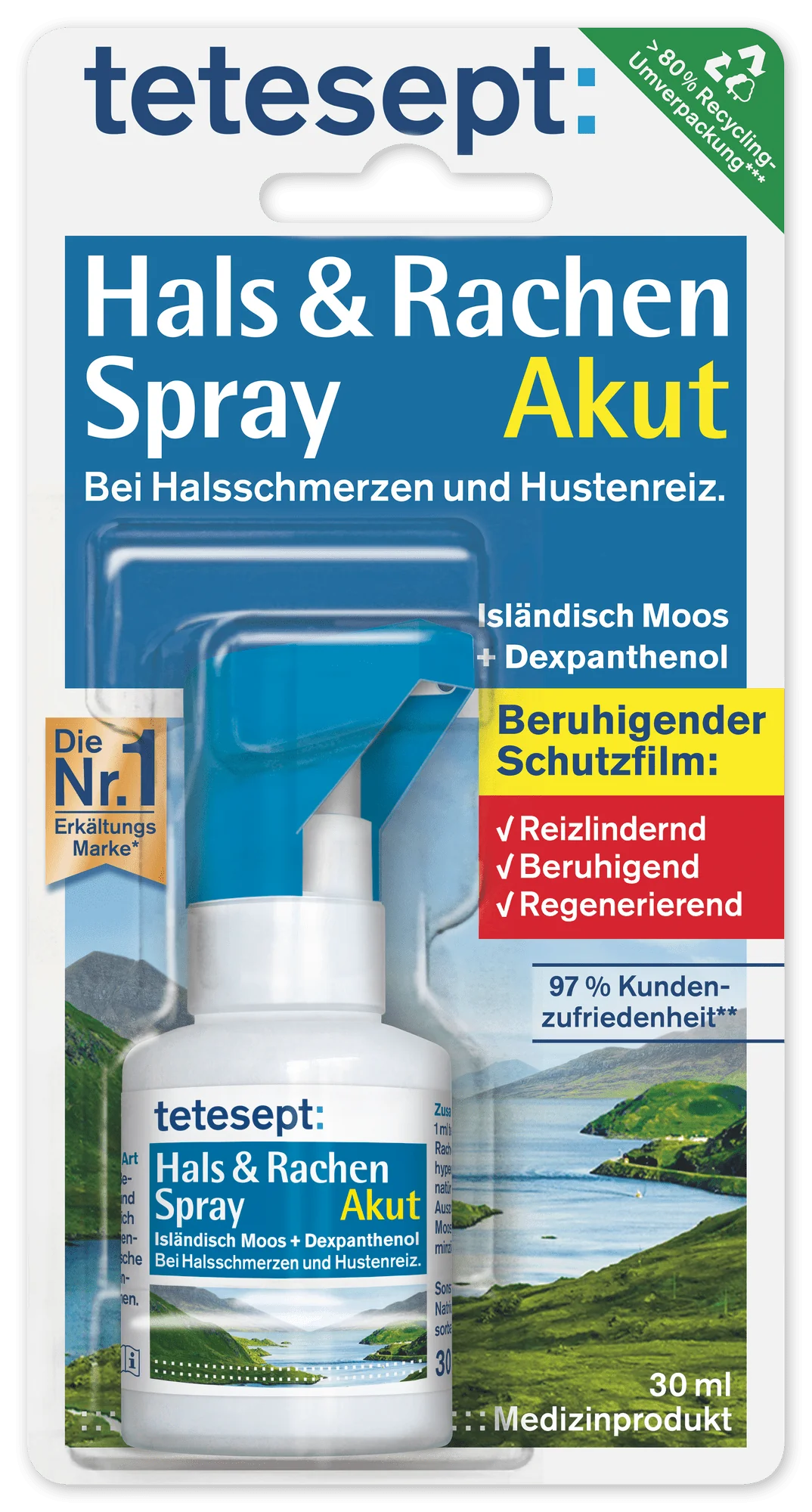 含有冰島苔癬+泛醇的tetesept喉嚨和喉嚨急性噴霧可滋潤喉嚨,進而緩解急性喉嚨痛和咳嗽。